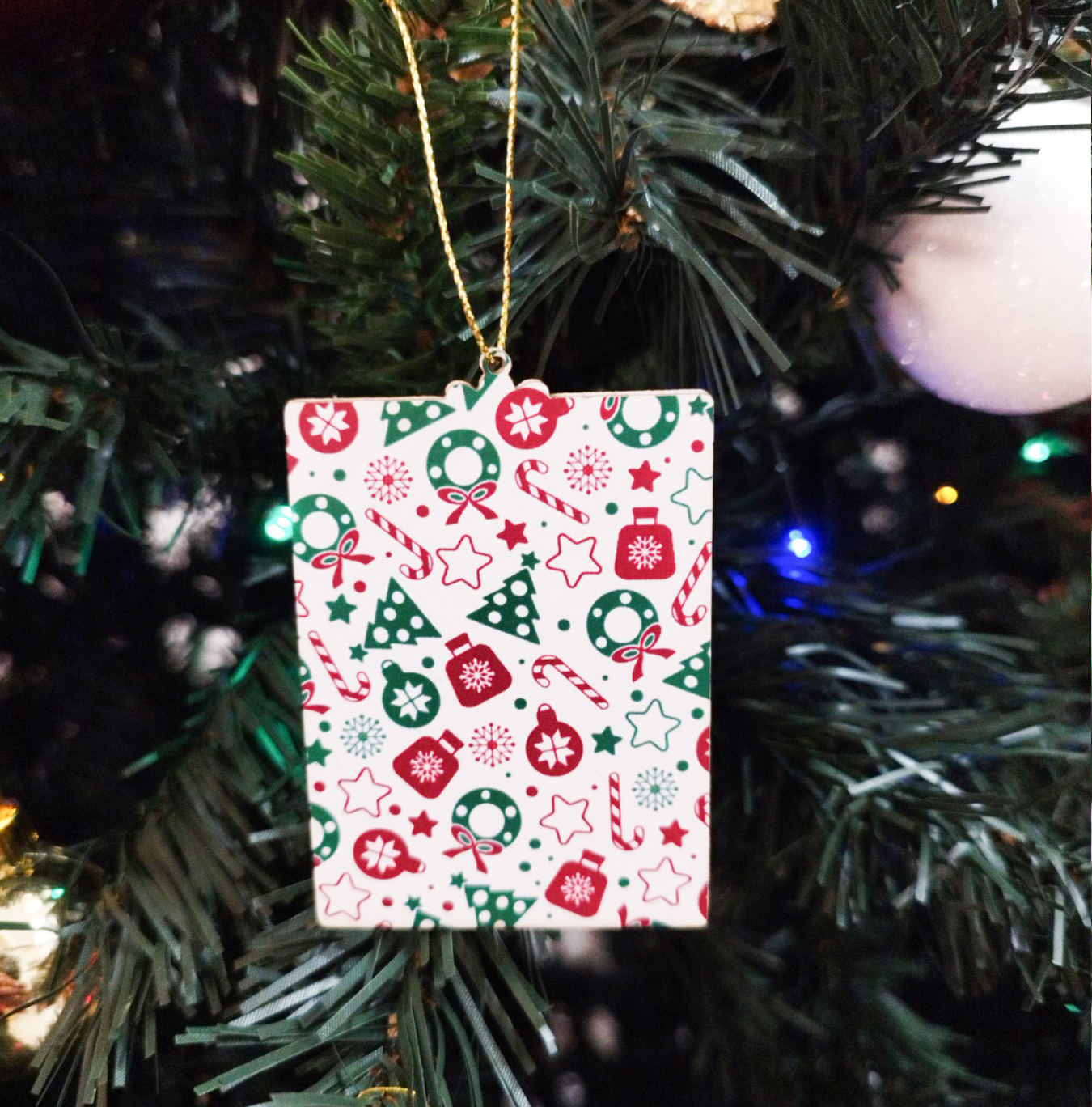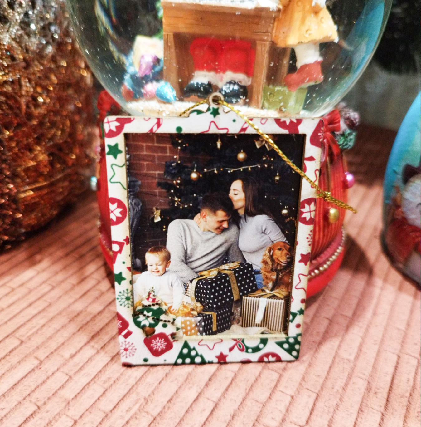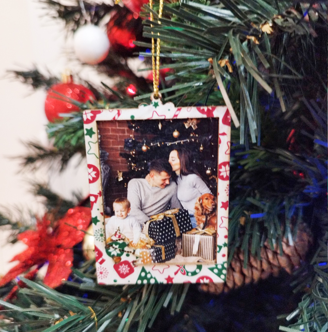 Коледен орнамент за елха с форма на Правоъгълник. Изработена от Чипборд картон – 2 части по 1 мм и цветен принт. Размер: 7.5х8см. Преди приключване на поръчката, в последната стъпка прикачете снимката или снимките, които искате да отпечатаме.